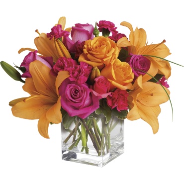 Tres chic! Send that special someone a stylish sentiment with the bright colors of this modern arrangement. Summery hot pinks and oranges are contrasted by the cool clarity of a simple cube vase. An eye-catching everyday choice!
